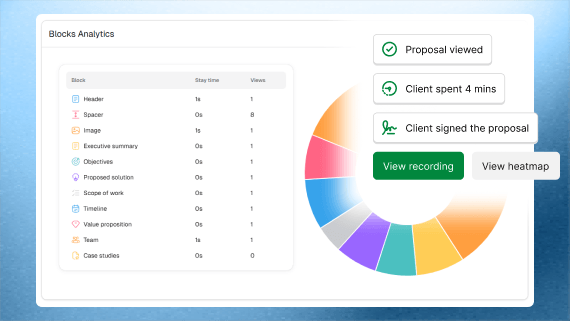 Send a live proposal - not a PDF attachment. See which sections your prospect spent time on, when they came back, and sign off without a single follow-up email about "did you get my proposal?"