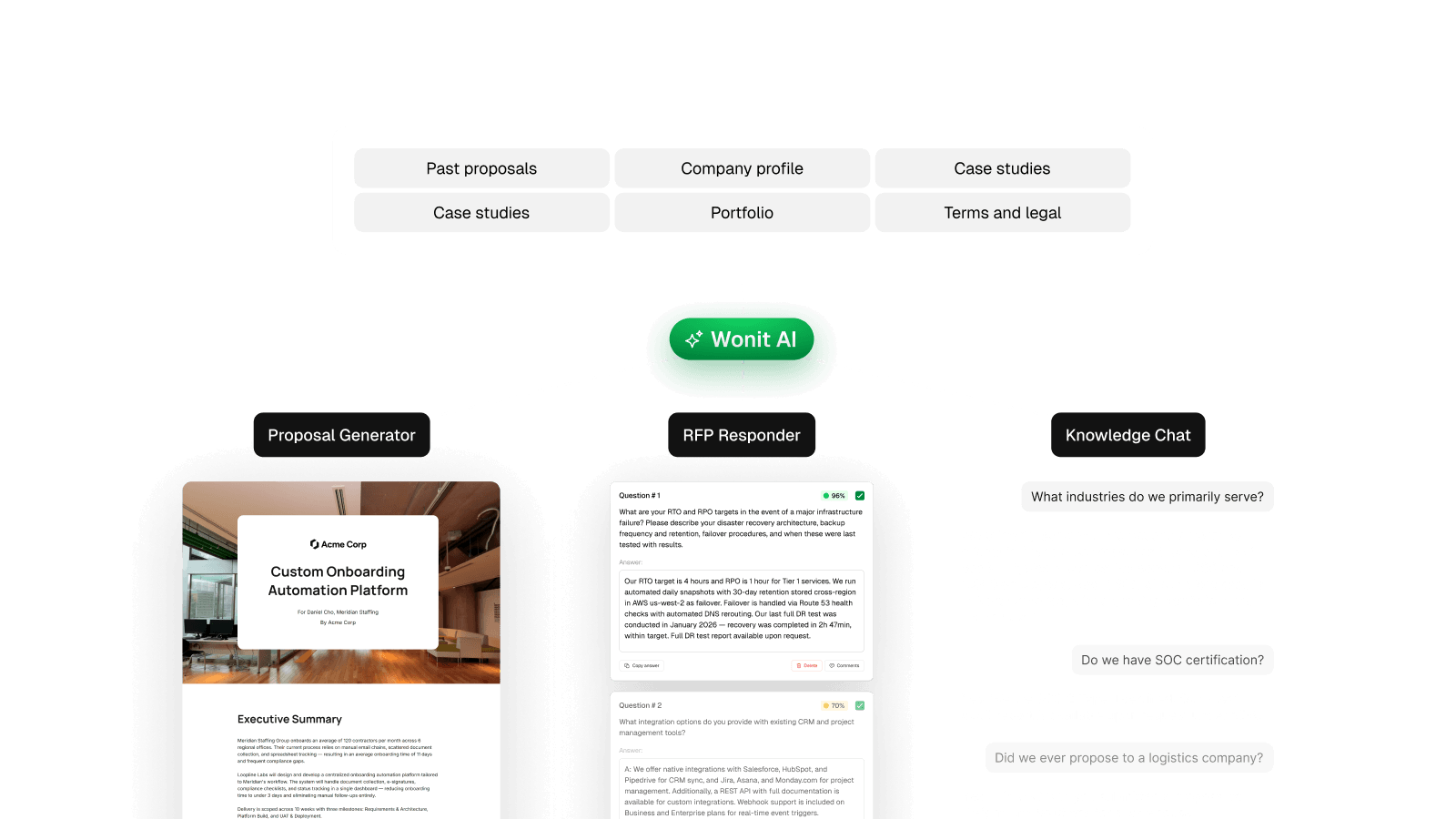 Upload past proposals, case studies, and company profiles once. Wonit uses them to generate proposals, answer questionnaires, prep for sales calls, and get smarter with every document you add.